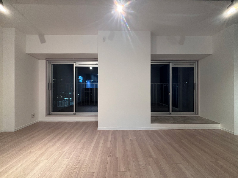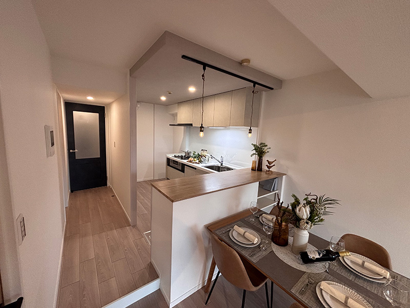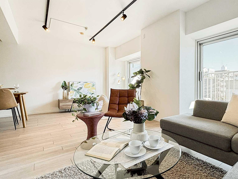 室内窓や照明の空間演出を取り入れた、モダンなマンションのお部屋